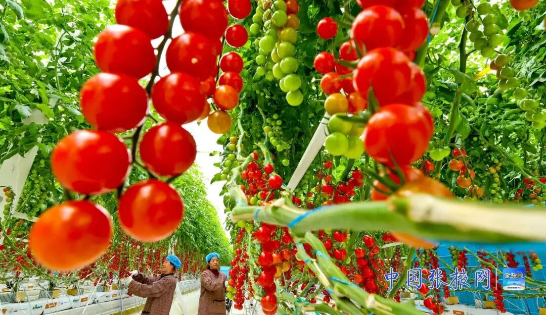 11月18日,位于张掖市甘州区三闸镇的三和智慧农业产业园现代农业智能温室10多万平方米工业化蔬菜栽培车间里,红彤彤的“串番茄”挂满枝头,进入成熟采摘季,工人们正