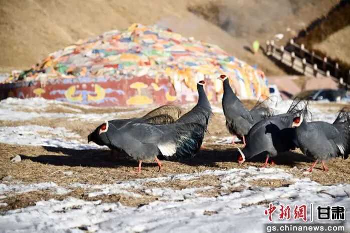 11月29日,雪后的张掖市肃南裕固族自治县马蹄寺景区银装素裹,生态环境持续向好让蓝马鸡频繁现身,成群结队在景区内觅食嬉戏,成为冬日里一道灵动的生态风景线。