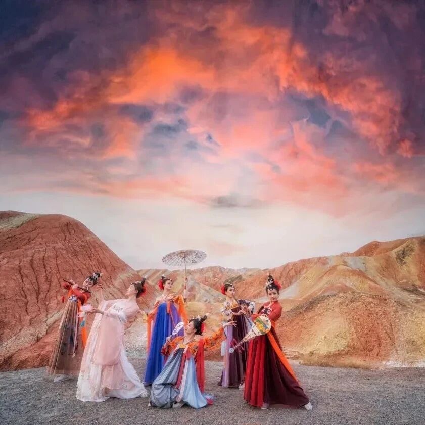 晨曦中的七彩丹霞,宛如打翻的调色盘,绚丽夺目;夜幕降临,丹霞口文旅小镇灯火璀璨,《回道张掖》的驼铃声在夜色中回荡。