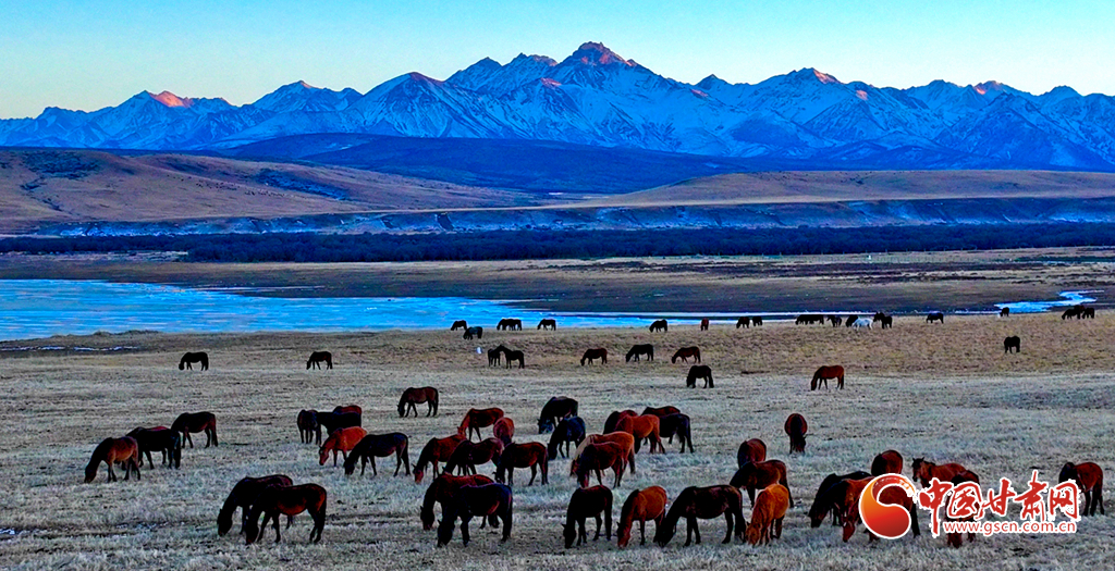 12月2日傍晚,夕阳映照下的张掖山丹军马场,祁连雪山巍峨..