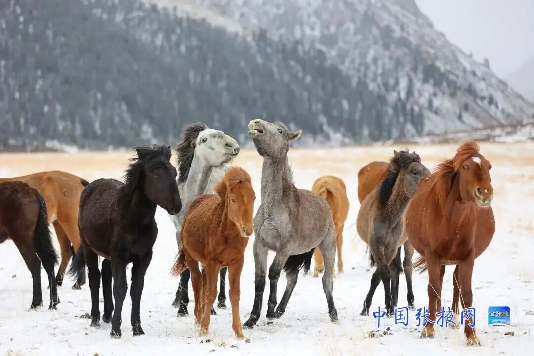 雪落无声,山丹马场披上银装。蓝天、白云、远山与雪原相映,..