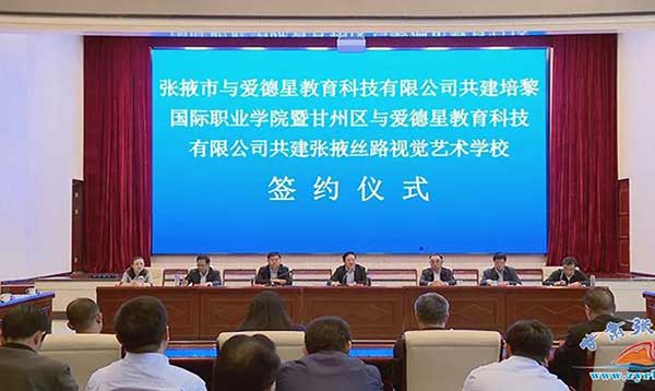 张掖市与爱德星教育科技有限公司共建培黎国际职业学院暨甘州区与爱德星教育科技有限公司合作创办张掖丝路视觉艺术学校签约仪式举行杨维俊张健谢又生关尧秦新民邢如瑞刘新明等出席9月23日,张掖市与爱德星教育科技