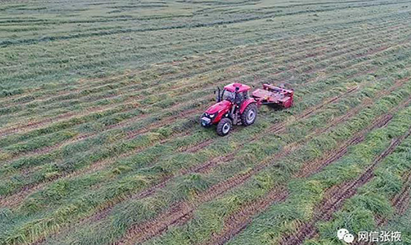 2019年9月23日,山丹马场21万亩营养丰富、价值颇高的燕麦草开镰收割。山丹马场地势平坦,昼夜温差大,十分适合燕麦草这种优质牧草的生长,这为山丹马场燕麦草产业的发展提供了“地利”。(王超)