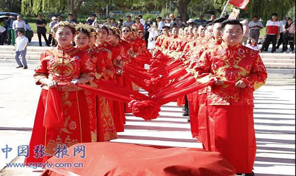 为大力弘扬移风易俗,婚事新办的社会新风,倡导文明节俭、健康向上的生活方式,9月1日,甘州区“抵制高价彩礼倡导移风易俗”中式集体婚礼在润泉湖公园举办。19对新人通过中式集体婚礼的形式,在全区广大青年中倡