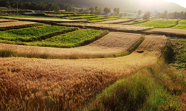 处暑时节,位于张掖民乐县境内的祁连山下小麦正值丰收时节,金黄的小麦、绿色的豆类植物和苜蓿,将大地分割成了调色盘,宛如一幅幅绚丽的田园画卷。(成学磊摄)