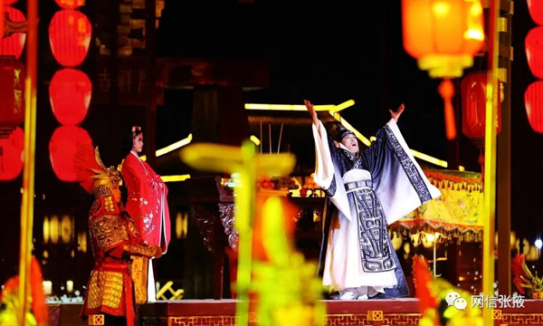 2020年8月25日晚,农历七夕节,中国首个以汉代历史为背景的大型实景光影剧《张国臂掖》在张掖市甘州区碱滩镇古城村屋兰古镇景区惊艳首演。该剧充分运用声、光、电、灯、烟、雾、机械以及现代艺术造型,与非遗