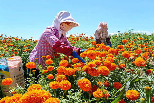 2020年8月13日,初秋时节,张掖市民乐县六坝镇的村民们忙着采摘第二茬万寿菊花。