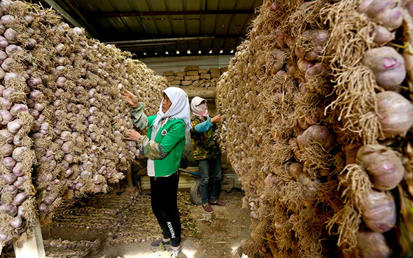 2020年8月13日,张掖民乐县洪水镇吴庄村农户正在晾晒棚里晾晒手工辫好的紫皮大蒜。连日来,民乐县蒜田里到处都是挖蒜、拾蒜、手工辫蒜、分拣和包装发运的忙碌景象。今年,民乐县农户种植的3万亩紫皮大蒜喜获