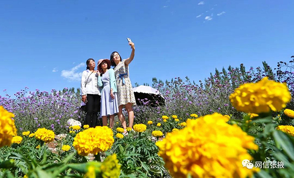 2020年8月8日,张掖市临泽县流沙河花海旗袍爱好者在向游客表演旗袍秀。连日来,张掖市临泽县流沙河花海、丹霞花海、丹霞高速花海,三个花海种植的马鞭草、香水百合、洋桔梗、非洲菊、卡罗拉刺玫等花草竞相绽放