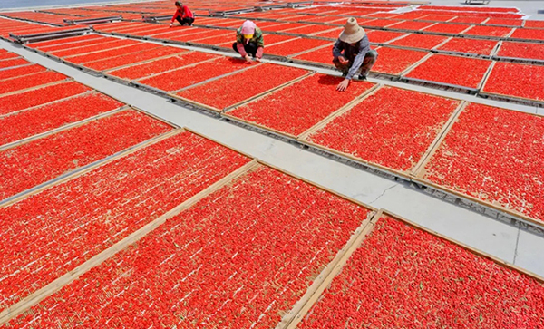 2020年8月4日,位于祁连山北麓的张掖甘州区安阳乡苗家堡村有机枸杞种植示范基地“扶贫车间”里,农户在晾晒收获的枸杞。连日来,张掖甘州区安阳乡苗家堡村种植的2000亩有机枸杞进入收获大忙季节,用工量每