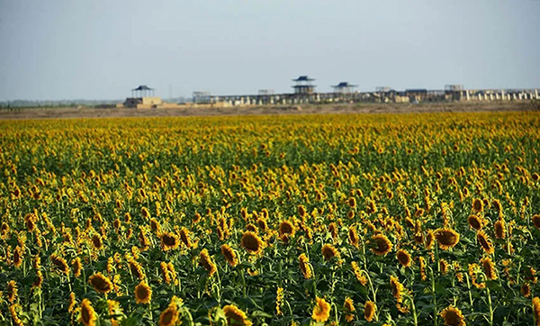 2020年8月4日,张掖市高台县黑泉镇十坝滩上种植的千亩向日葵摇曳生姿,迎风绽放,如金色的海洋。(郑耀德摄)编辑:刘淑萍