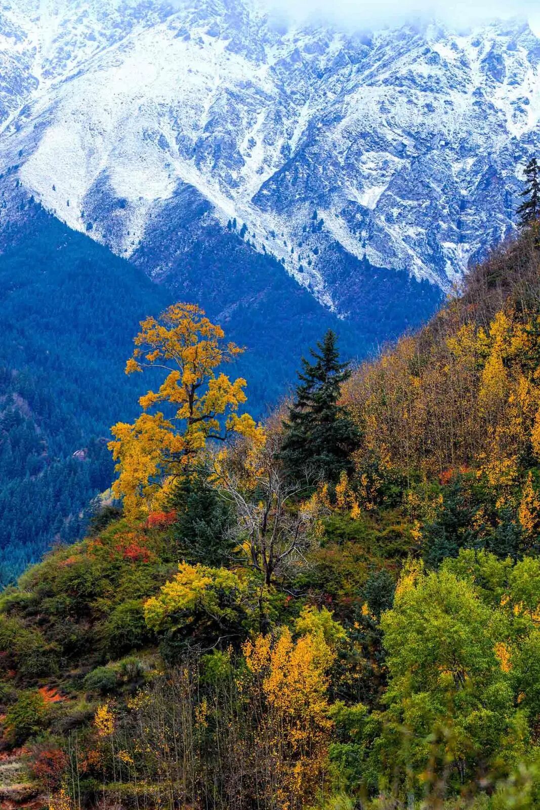 10月11日,一场小雪过后,祁连山国家公园张掖市肃南裕固族自治县马蹄乡段山顶白雪皑皑,山间云雾缭绕,树木层林尽染,形成色彩斑斓的深秋美景。