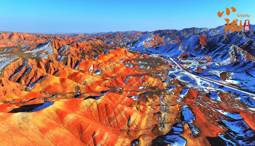 立春时节,张掖七彩丹霞原本浓艳的赤红更显炽烈,明黄愈发鲜亮,与青灰、墨黑的岩壁交相辉映,碰撞出“冰与火”交织的奇幻意境。