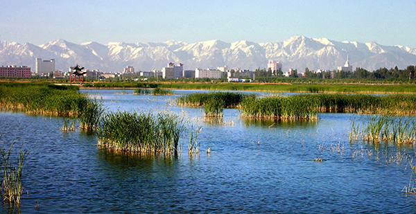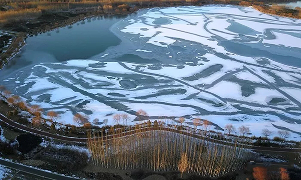 2019年12月5日拍摄的张掖滨河新区芦水湾景区(无人机航拍)。近日受寒潮影响,张掖迎来降雪降温,滨河新区芦水湾景区湖水结冰,树木落雪。冰雪交融自然形成各种韵律十足的美丽图案,成为冬日一景。(成学磊摄