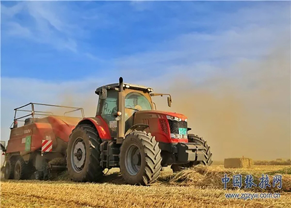 11月28日,在甘肃山丹马场,数十台大马力拖拉机牵引着机具设备驰骋在21万亩燕麦草田中,黄灿灿的燕麦草瞬间变成草墩流出车厢。在浓郁的草香中,自走式割草压扁机、打捆机、摊晒机、指盘式搂草机、多功能集垛车