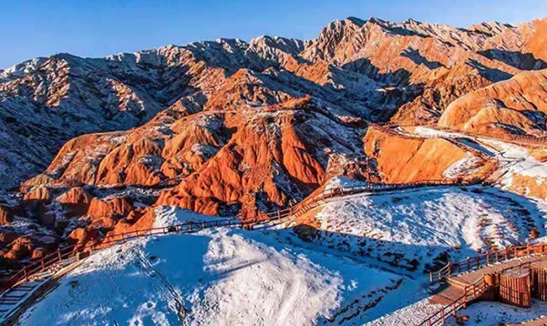 雪,一夜之间染白了山头。七彩丹霞最美丽的时候就是雪降临的时节。七彩的土地与洁白的积雪交相辉映,丹霞奇观在冬雪的映衬下颜色更加鲜艳,吸引了无数游客前来观看这绝美的景色。图片来源:见水印在七彩丹霞景区,得