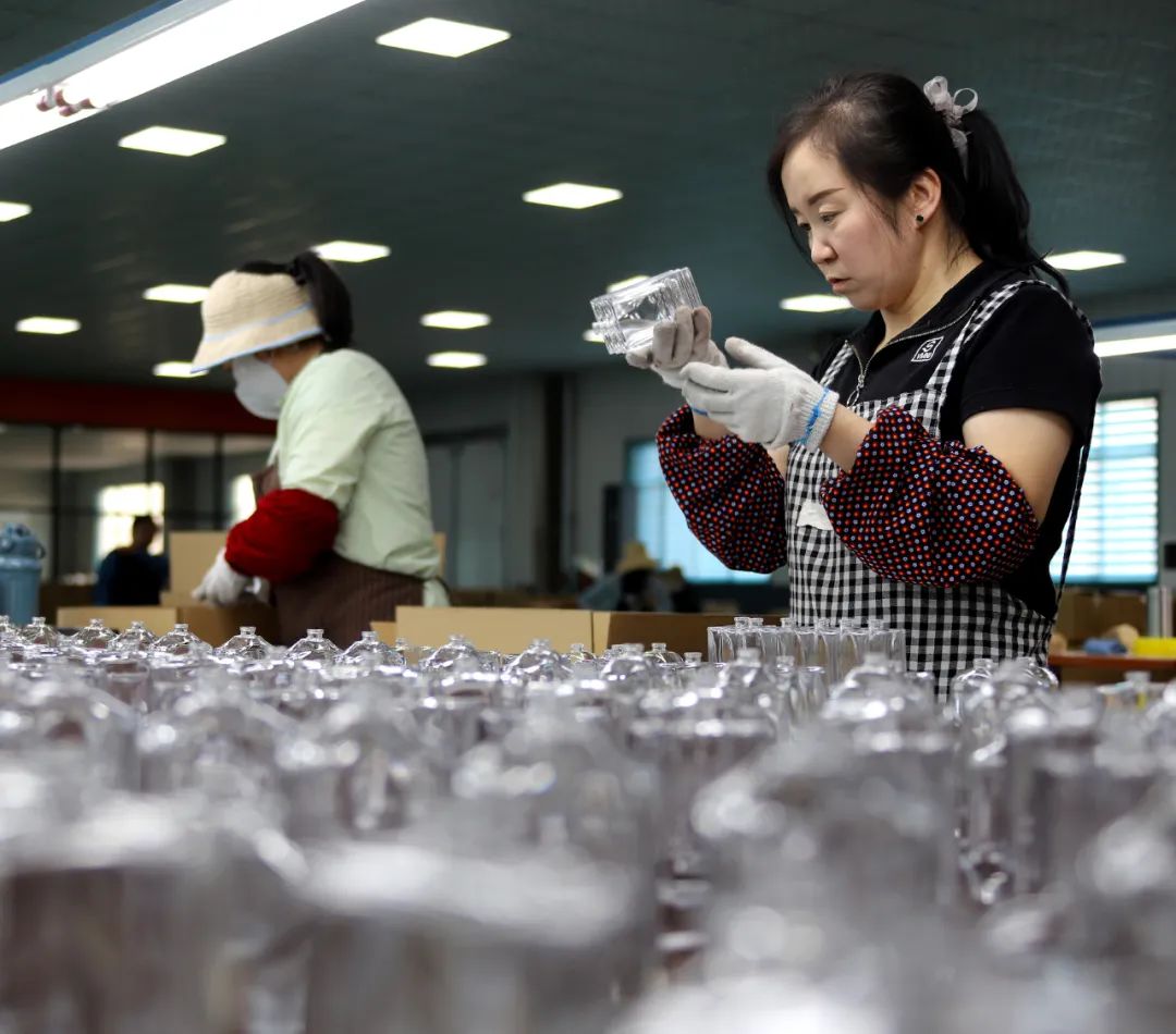 5月20日,甘肃富地金虹玻璃制品有限公司质检车间内,操作人员正在对化妆品瓶进行容量测试。