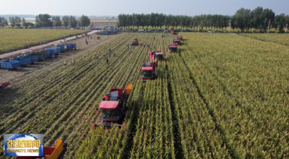记者施婷婷:“眼下正是制种玉米收获的季节,我现在所在的位置是甘州区沙井镇的制种基地,我身后的大型收割机正在轰鸣作业,一颗颗沉甸甸的玉米果穗随即归仓。”