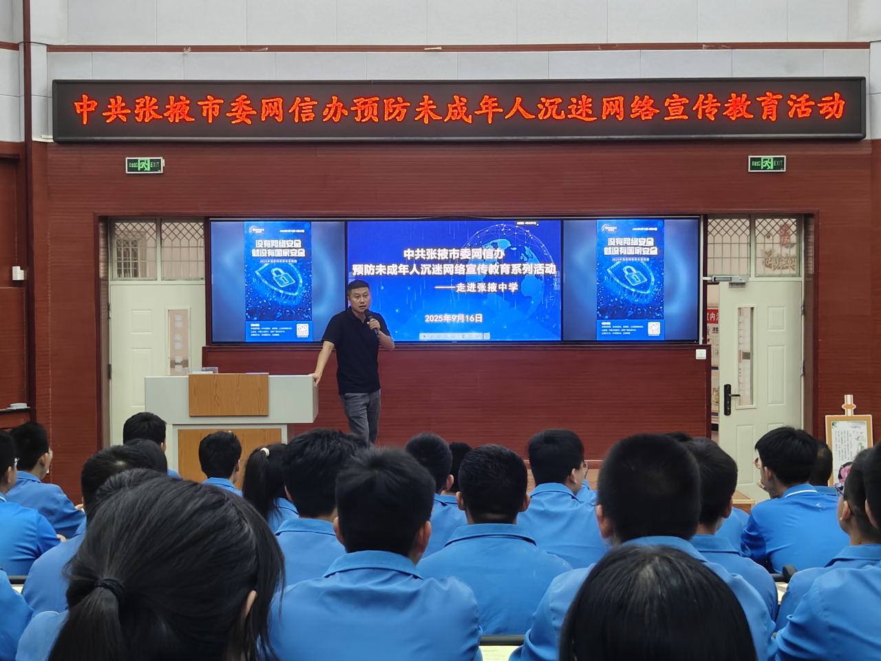 为进一步增强未成年人网络安全意识,树立正确网络观念,在2025年张掖市网络安全宣传周暨网络文明宣传月同期开展之际,市委网信办联合市教育局深入张掖中学开展预防未成年人沉迷网络宣传教育活动,围绕“护苗成长