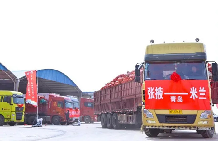 3月25日,张掖鲜活农产品出口欧洲的转运大货车从张掖现代戈壁农业产业园区发年农产品蔬菜生产基地驶出。