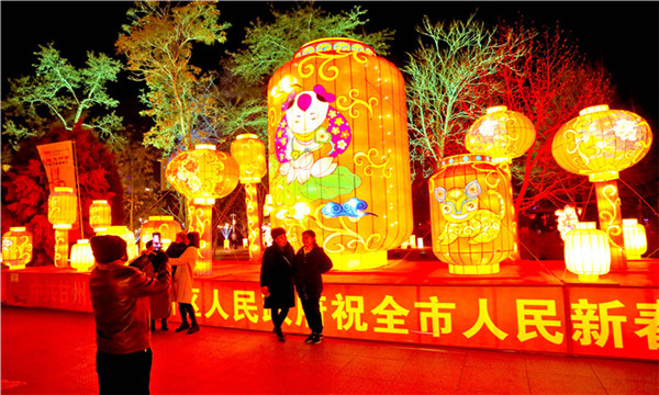 当日是农历大年初二,张掖众多市民走出家门,观赏现代科技与传统文化现结合的各种光影秀和花灯展,欢欢喜喜过大年。(王将摄)2021年2月13日,张掖甘州区甘泉公园内,市民在观赏新春大型文创3D光影秀视觉盛