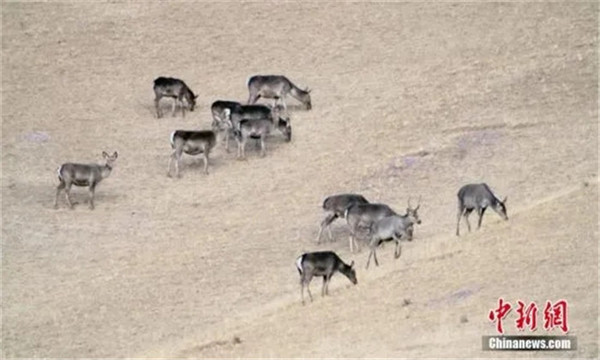 图为马鹿在山坡上悠闲吃草。吴生文摄2月5日,在祁连山国家公园甘肃肃南段发现近百只野生马鹿种群,这群马鹿分两处在山坡上悠闲吃草,随着太阳的升起,鹿群越过围栏,消失在松林、灌木丛中。据了解,马鹿为国家二级