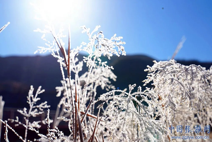 1月28日,肃南县中华裕固风情苑最低气温降到了零下18摄氏度,肃南县中华裕固风情苑小溪边的草木上冻出了美丽的冰花、挂起了雾凇,像羽毛、像雪花,晶莹剔透、冰清玉洁,大自然的鬼斧神工让严冬平添几分妩媚。(