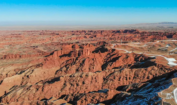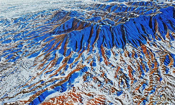 近日,地处张掖市高台县罗城镇常丰村的红山嘴,一场雪后,显现出大片的丹霞地貌,将茫茫戈壁染成了鲜红的色彩,在午后阳光的照射下蔚为壮观。(郑耀德摄)