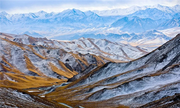 图片2020年12月10日,受寒流侵袭位于张掖肃南裕固族自治县境内的祁连山连降瑞雪,雪后的祁连山山群逶迤,银装素裹,妖娆多姿;积雪覆盖了层层山峦,未被白雪覆盖的草原闪耀着金色的光芒,放眼望去犹如一幅美