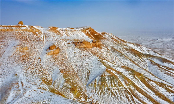 2020年12月12日,张掖市临泽县板桥镇羊台山,经过风雪的洗浴,矗立在茫茫戈壁雪野中,显得空旷而寂静、雄奇而壮美。羊台山是临泽县板桥镇北部荒漠戈壁滩上一座突兀平顶的独立山体,山顶有一座建于明代的烽燧