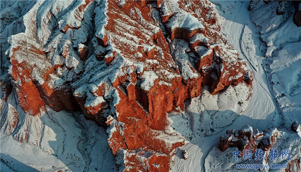 12月9日,在张掖市临泽县板桥镇红沟丹霞,雪后初晴,丹霞披纱,更显赤艳,成为冬日一道靓丽风景。(杨永伟 刘永高 摄)