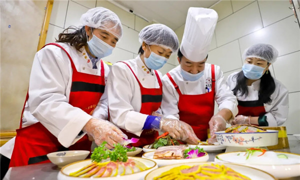 2020年12月3日,张掖农家巧娘厨艺培训班上,大厨们在手把手的教农家厨娘们制作凉菜拼盘。当日,张掖农家巧娘厨艺培训班实际操作菜品展示中,经过多日培训的100多名“农家乐”和农家饭店的巧厨娘们,把所学