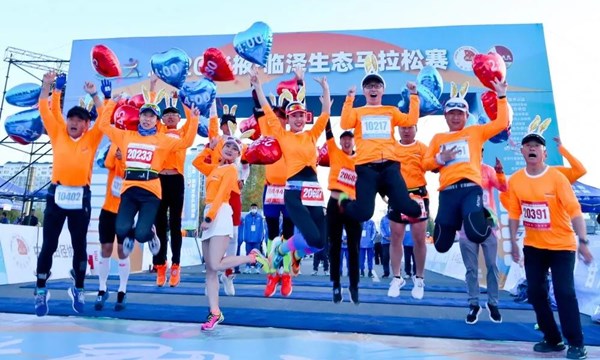 2020年10月18日,张掖临泽县流沙河景区参加2020生态马拉松全程赛的选手们听到枪声后开始起跑。当日,临泽生态马拉松鸣枪开赛,来自广东、江苏、陕西和甘肃本地的4800多名选手参加了全程42.2公里