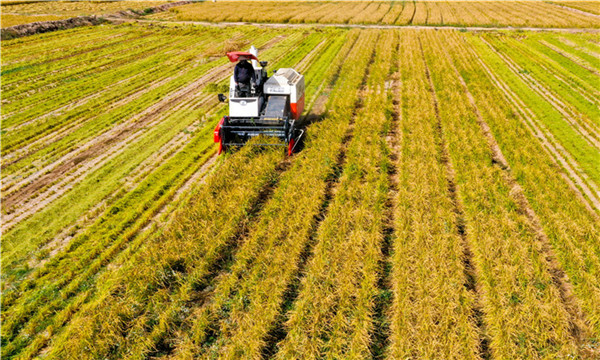 2020年9月25日,位于祁连山北麓,中国第二大内陆河--黑河岸畔的甘肃张掖甘州区乌江镇大湾村的农户正在紧抓晴好天气收割成熟的旱稻和“黑芒稻”。当日,甘肃张掖甘州区乌江镇种植的3000多亩旱稻和“黑芒