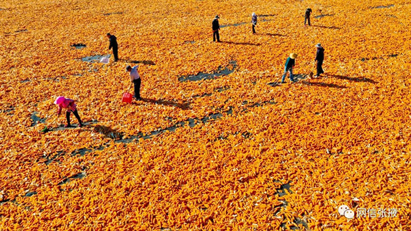 2020年9月17日,张掖高台县合黎镇秋乐种业制种玉米晾晒基地上工作人员正在晾晒制种玉米。