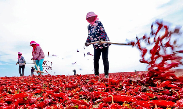 2020年9月7日,张掖市高台县黑泉镇十坝滩上,高台富鹏种植农副产品农民专业合作社的农户们正在兴高采烈的晾晒红辣椒。连日来,高台黑泉镇种植的5000多亩辣椒喜获丰收,产量达7500多吨,农户每亩可收入