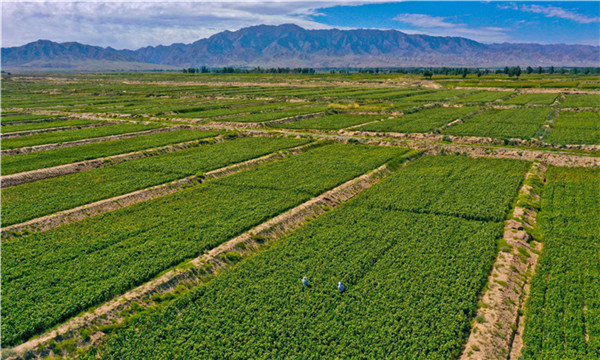 2020年9月3日,甘肃张掖市甘州区振惠种植农民专业合作社的农户们正在安阳乡毛家寺村连片种植即将成熟的千亩谷子种植基地里除草。连日来,秋天的太阳普照着一望无际的祁连山下谷子种植基地,即将成熟的谷穗像田