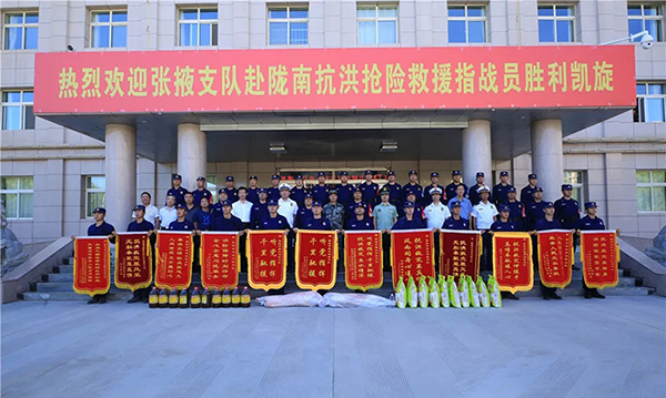 抗洪抢险英雄归来热烈欢迎抗洪抢险英雄胜利归来同甘苦共患难团结一致夺取抗洪抢险的最后胜利9月3日下午3时,张掖市森林消防支队门口锣鼓震天,掌声雷鸣,张掖市森林消防支队赴陇南抗洪抢险救援指战员从陇南安全返