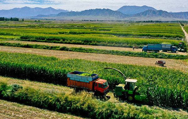2020年9月3日,位于祁连山下的张掖市甘州区安阳乡金王庄村的农户们正在忙碌着收割种植的2000多亩青贮玉米。