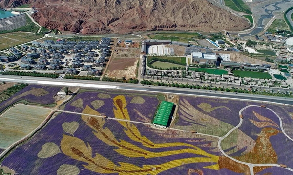 一只硕大的振翅欲飞的凤凰花卉造型图案在张掖丹霞口花海里惊艳亮相,吸引众多游客观赏。凤凰是中国传统文化寓意富贵吉祥的神鸟,象征着幸福与祥瑞。(记者成林)