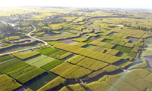 2020年9月1日航拍张掖市甘州区碱滩镇。初秋时节,张掖祁连山下碱滩镇境内一片秋意盎然,成片的树木和待收获的庄稼形成了各种灵动的几何图案,形成了一幅独特的画卷。(成学磊摄)