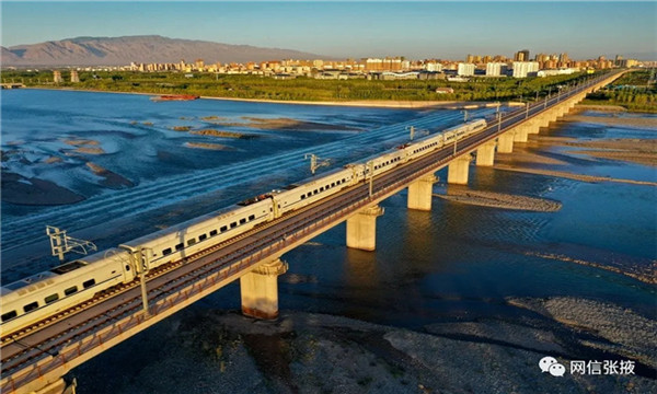 9月1日傍晚,兰新铁路一列动车急速驶过张掖黑河大桥。湛蓝的河水与沿岸茂盛的树木构成黑河两岸一道靓丽的景观。(记者成林摄冯乐德)编辑:李永杰