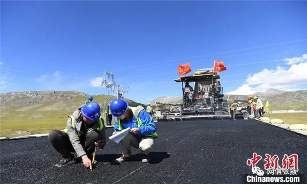 9月2日,由中铁四局承建施工的肃(肃南)祁(青海祁连)G213线公路沥青在雪域祁连山下开始摊铺。杨艳敏 摄9月2日,由中铁四局承建施工的肃(肃南)祁(青海祁连)G213线公路沥青正式摊铺,标志着“一带