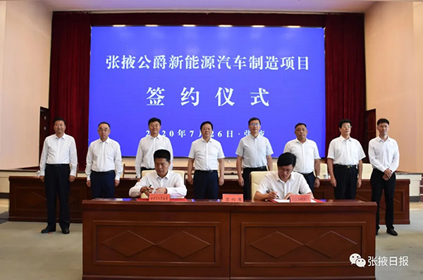 张掖市与江苏公爵新能源汽车有限公司签订战略合作框架协议杨维俊谢又生张健关尧周祥等出席签约仪式7月26日,张掖市甘州区政府与江苏公爵新能源汽车有限公司签订战略合作框架协议。市委书记杨维俊,市委副书记、市