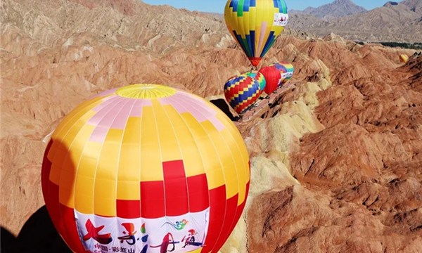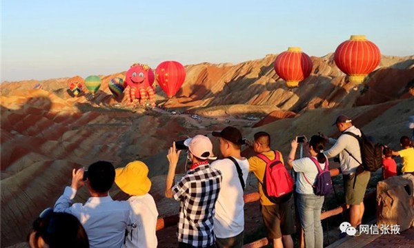 7月26日,百具热气球在张掖七彩丹霞景区上空飞舞,与色彩艳丽的丹霞交相辉映,蔚为壮观,吸引大批游客观赏。当日,第二届中国·张掖七彩丹霞(国际)热气球节在张掖七彩丹霞景区拉开帷幕,100具热气球将举行4