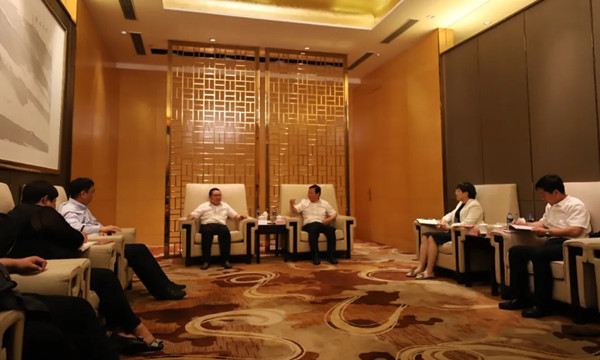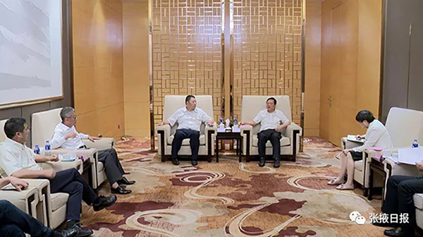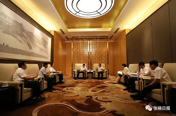 7月1日,市委书记杨维俊与前来参加第26届兰洽会张掖招商引资项目签约仪式的环城旅游股份有限公司董事长李丹、上海电气环保集团总裁王小弟、北京定理云天生态环保科技有限公司董事长葛宁座谈,就加快推动相关合作