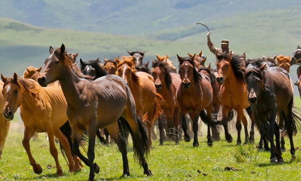 2020年6月29日,盛夏时节,位于祁连山北麓张掖山丹马场绿草如茵的草原上,牧马人放牧途中,奔跑的马群现万马奔腾美景。山丹马场位于河西走廊中部,是中国乃至亚洲最大的优良马匹繁育基地,山丹马场地势平坦,