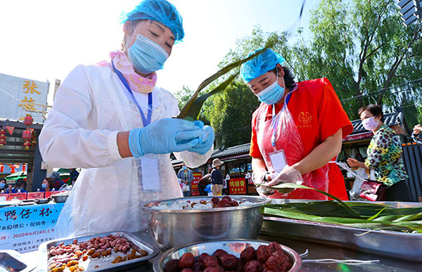 2020年6月24日,市民在张掖甘州区万家便民市场内参加“浓情端午”包粽子大赛。当日,张掖甘州区由职工、干部、市民组成的40多支代表队在张掖甘州区万家便民市场内进行“浓情端午”包粽子大赛,在紧张激烈的