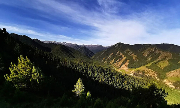6月14日,航拍镜头下的肃南县境内祁连山隆畅河林场管护的水源涵养林郁郁葱葱。祁连山是河西走廊重要的生态屏障,肃南县拥有祁连山北麓70%的面积,有水源涵养林33万公顷,森林覆盖率21.8%,三大内陆河黑