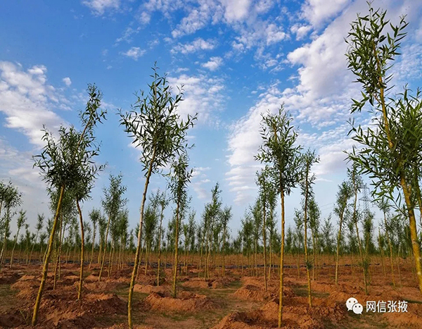 初夏时节,张掖黑河滩胡杨林生态公园里,今年栽植的胡杨苗木长势良好,郁郁葱葱,胡杨林生态公园雏形初现。
